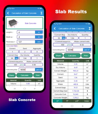 ✔ Calculate cement, sand and aggregate amount in concrete.