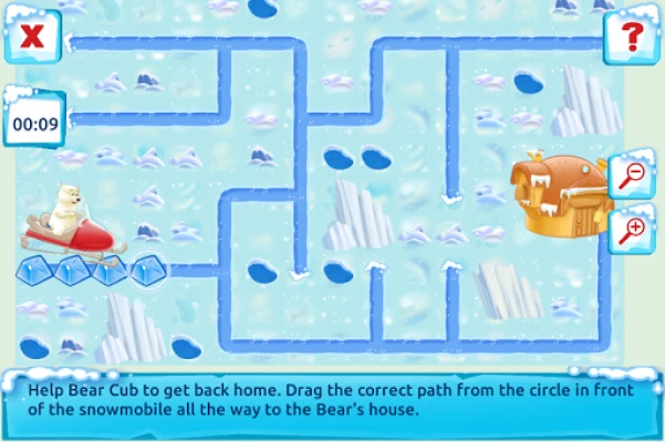 Example tasks: recall who lives in which house; place the pictures in the correct order; puzzles; memory cards; guess the logic of a sequence of objects; find the correct walrus; find two similar pieces of ice; mazes for toddlers and other educational mini-games for small children.