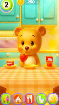 Keep your Talking Bear happy by engaging in daily activities. Give him a bath in his great bathroom, dry him off with a towel, and make sure he stays clean and cute. Relax on the sofa in the living room with your Talking Bear, and don't forget to feed him a variety of delicious foods when he gets tired from playing.